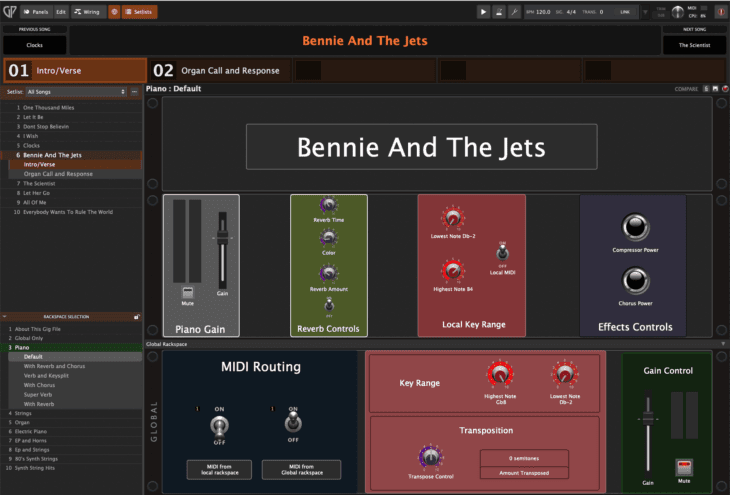 GP5E is centered on its modular Rackspace system, rather than a timeline like a DAW. This allows users to build complex live setups and GP5E is compatible with VST3, VST, and AU instruments and effects. Each Rackspace can contain multiple signal paths, allowing musicians to manage real time performance of keyboard splits, guitar processing, or vocal chains without switching programs. Players can switch between Rackspaces instantly, changing the entire setup without reloading plugins. Within a Rackspace, variations allow parameter changes, such as adjusting mix levels or switching patches, while keeping the main structure active. This reduces CPU demand and prevents gaps in audio when changing sounds.