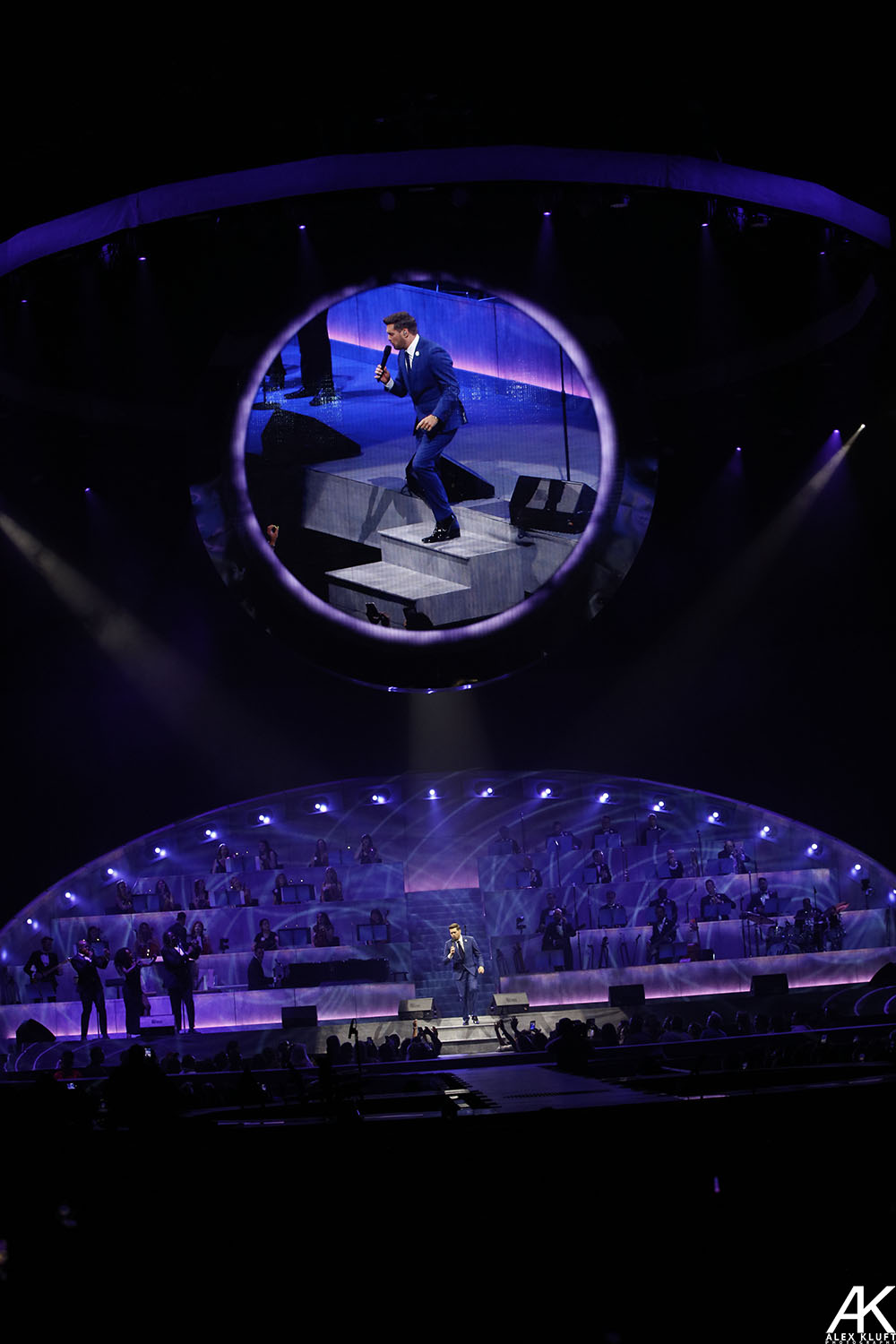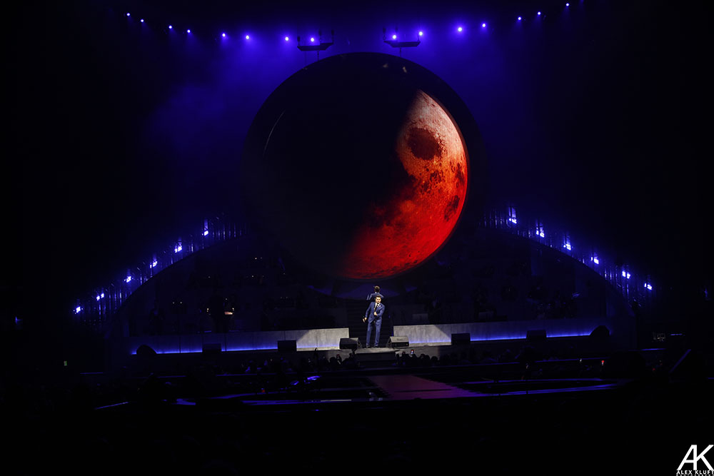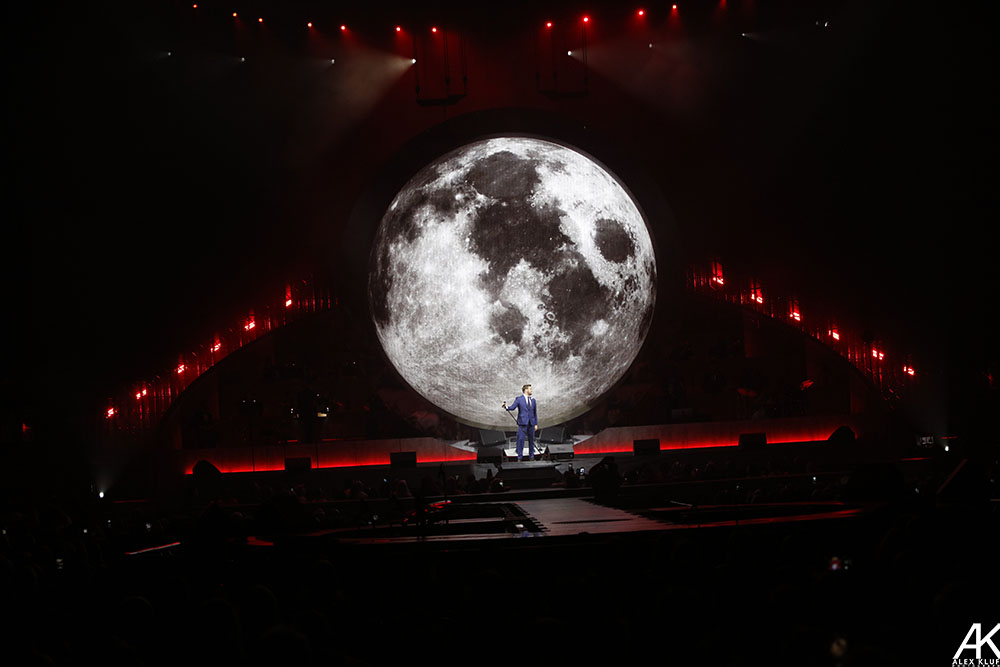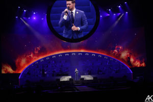 For being an arena show, Bublé made it feel very intimate especially for the portion of the show where he and several band members play at the end of the catwalk. He sang right to the fans and greeted them. Bublé made a grand entrance at the top of a staircase located in the middle of the stage. The stage was set up with the band divided into two halves with a large circular screen that moved up and down during different parts of the show. This screen complemented the performance rather than distract the audience. Bublé played a 23-song set consisting of originals and covers by artists like Dean Martin, Louis Prima and Chuck Berry. Bublé tricked the crowd earlier in the show after mentioning that he saw Hugh Jackman was playing the Hollywood Bowl and convinced the audience to believe that Jackman was going to make a surprise appearance on stage (he didn't). Bublé also traded off vocals on Alicia Keys' “Girl On Fire” and “Theme from New York, New York.” Bublé’s trumpet player was featured on Russ Morgan’s “You’re Nobody Till Somebody Loves You.”