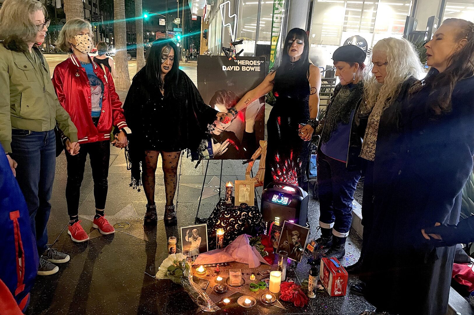 We joined dozens of dedicated fans who gathered at the star – in front of the former home of the now-shuttered Knitting Factory L.A. music club, now an LA Fitness facility– to honor their favorite musician on the 10th anniversary of his death. To them, he was more than a music maker. He was a diety who encouraged fans to make art and be art and to express themselves "in beautiful ways," one of them said. They brought flowers, lit candles, and played his songs, culminating in a ritualistic circle around the star as “Black Star” played from a boombox. They all said they felt him there at that moment, and so did we.