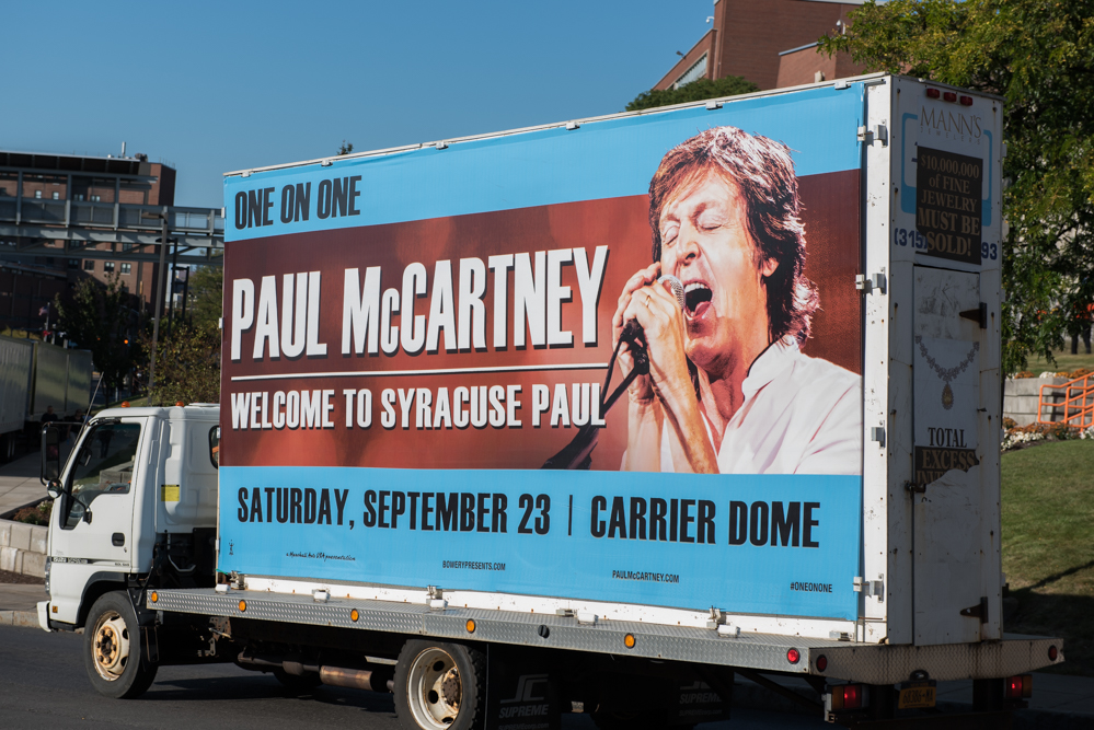 This Saturday, Syracuse, New York finally was able to welcome Paul McCartney to perform. His first visit, was supposed to be back in 1993, but was indefinitely postponed due to a scheduling conflict. Fast forward twenty-four years to now, and Syracuse is once again a city consumed with Beatle-mania. The campus was adorned with signs welcoming McCartney to Syracuse. In the afternoon leading up to the show, all of the typical Syracuse University hot-spots on “the hill” were overrun with fans of McCartney’s, most of which had been following him since his days in the Beatles.