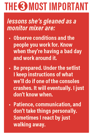 “When Pearl Jam goes on, I always tell the guys ‘Don’t ask me for anything until the third song,’” she says. “Because the audience noise will drop by then, front-of-house has dialed in its mix, and you guys are now settled on stage and can actually pay attention to what you’re missing. Most of the time after three songs we’re good and don’t need any changes.”