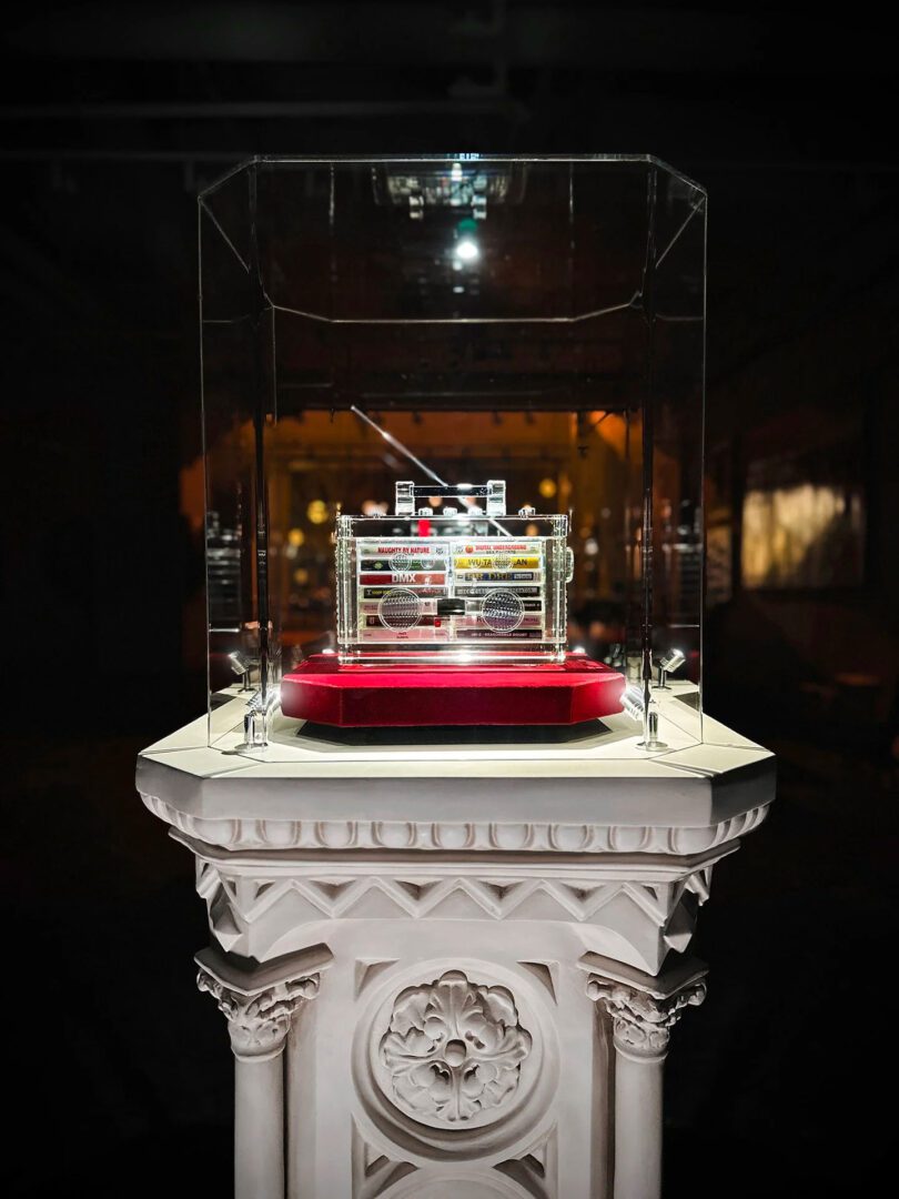 As each individual Rhyme Capsule sculpture arranges vintage cassette spines into a slow-building sequence—a horizontal score encased in resin or crystal, catching and scattering light with a beckoning prismatic clarity—Schwartz says that, “the part that excites me most is when I’ve been trying to figure out a certain piece for years and then suddenly I know it’s ready.”The large-scale boomboxes have the presence of cozy monuments; the minis constellate into something more like jewels or amulets. The pill pieces shift the idea into another register, each one an empathetic microdose of a specific year, a particular album, and a burnished emotion.