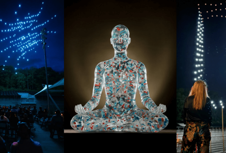 The music connection here is structural, as the exhibition functions as a “neuro-ceutical” environment where sound physically alters the visitor’s state of being. In the Seven Sisters installation, NASA light wavelength data is translated into a 12-minute choral soundscape designed to shift brainwaves, turning the gallery into a resonant chamber for the collective unconscious. This same synthesis animates Heart of the Ocean, where a steel and resin sculpture sings a song composed by the sea itself, its melody derived from real-time metrics of salinity, temperature, and migratory patterns.