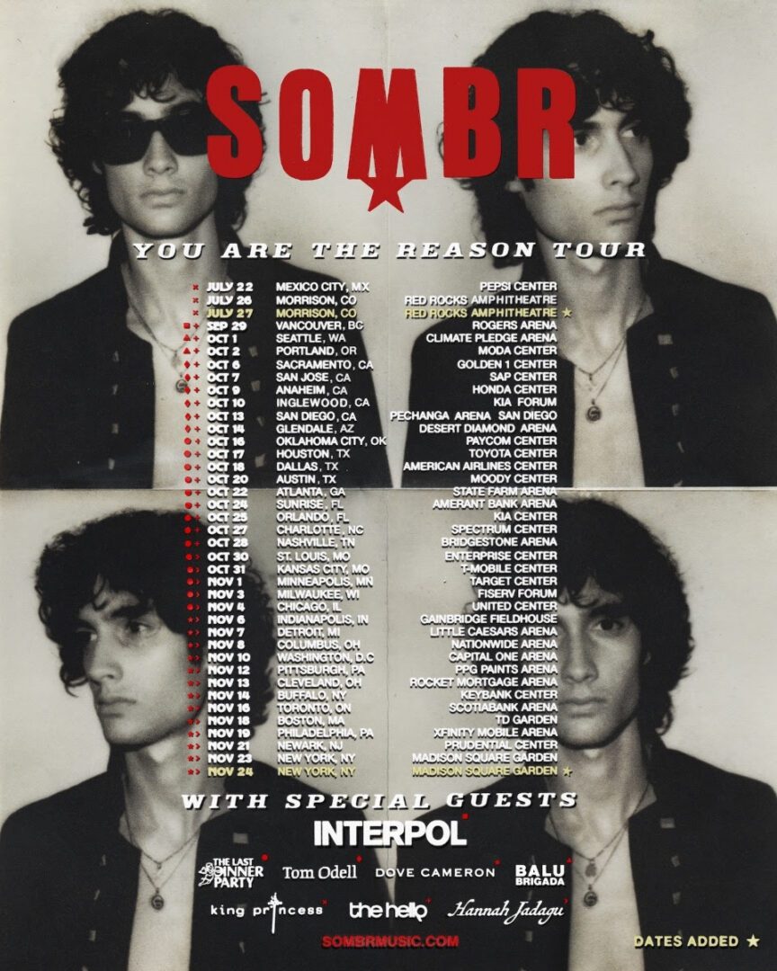 The lineup of support acts reflects SOMBR’s wide-reaching sonic orbit, with appearances from Interpol, The Last Dinner Party, Tom Odell, Dove Cameron, King Princess, and more rotating across dates. The eclectic mix mirrors SOMBR’s own blend of indie rock grit and polished pop ambition.